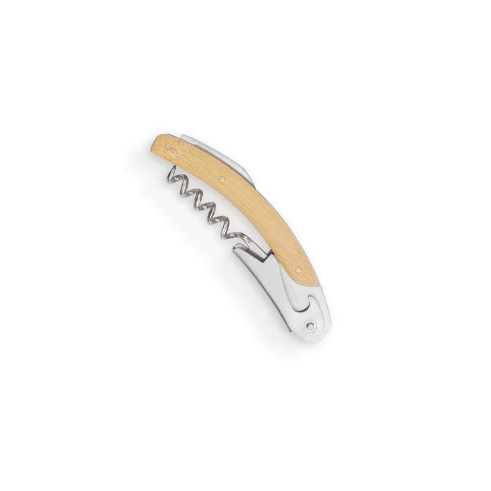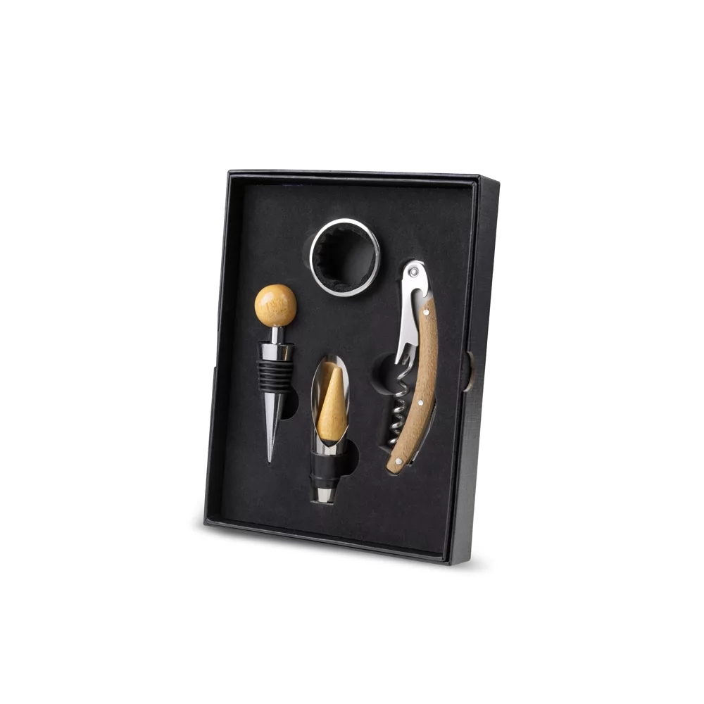 Kit vinho contendo 1 anel corta-gotas, 1 tampa de metal para garrafa, 1 bico dosador de metal e uma tampa de bambu e 1 saca-rolhas de metal e bambu com corta lacre. Acompanha caixa presenteável.